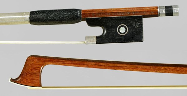 The Uebel family of bow makers is in its 4th generation and was founded in 1882. Klaus W.Uebel became a master bow maker in 1982. This beautiful bow has elegantly engraved silver mounts.