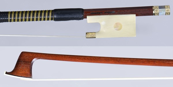 Pictured is one a fine, engraved, gold & mastadon mounted violin bows.